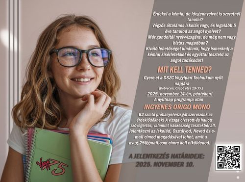 Érdekel a kémia, de idegennyelvet is szeretnél tanulni? Végzős általános iskolás vagy, és legalább 5 éve tanulod az angol nyelvet? Már gondoltál nyelvvizsgára, de még nem vagy biztos magadban?
